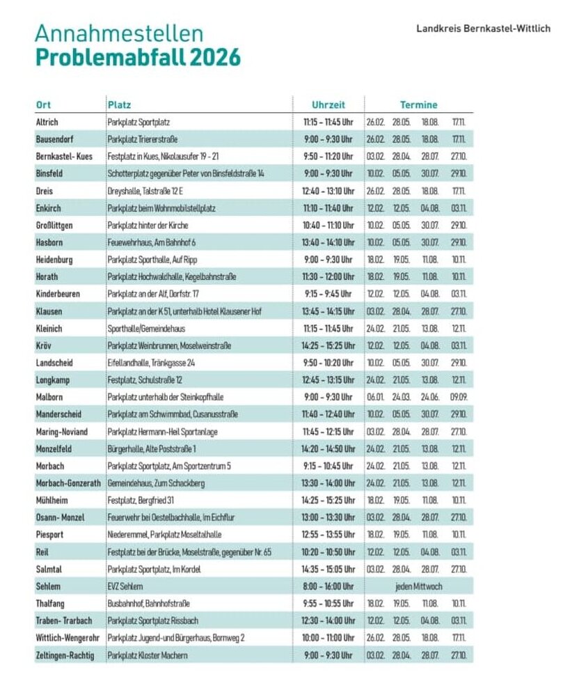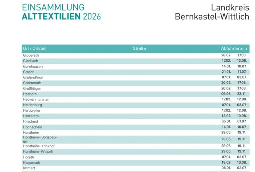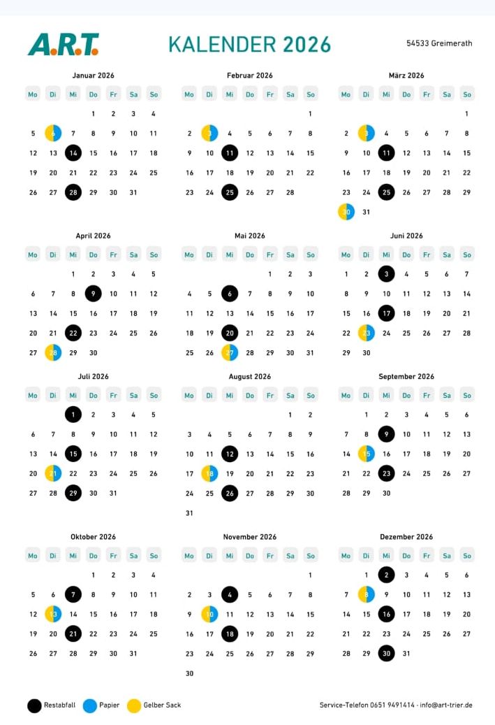 Die Termine für Greimerath sind am 20. Februar und 17. August 2026.
